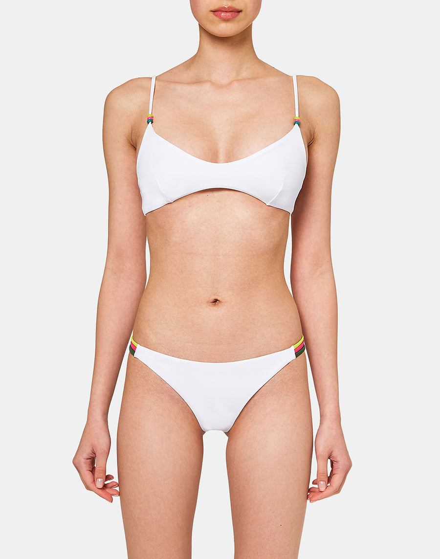 If you are searching for a stylish swimsuit, look no further than this bikini, made up of a padded bralette top with multicoloured beads and Brazilian briefs with tricolour bands on the sides.