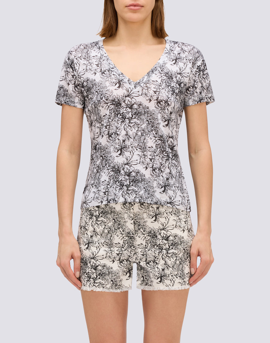 The Fleur De Joie women's summer t-shirt with short sleeves in linen with floral print is lightweight and perfect for summer. Made of soft linen, it guarantees a feeling of freshness and comfort during the hottest days. The floral print adds a touch of style to your summer outfit.